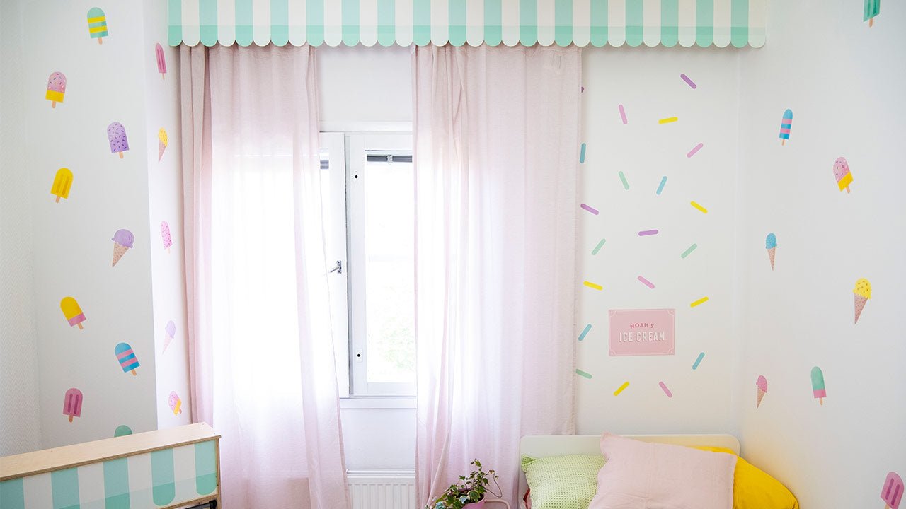 Sainte glace colorée, aujourd'hui nous allons vous montrer une manière vraiment rapide, amusante et facile de faire une rénovation complète de la chambre avec seulement des stickers muraux et quelques draps et rideaux colorés. Nous avons créé un ensemble complet de stickers muraux qui couvrent tous les aspects d'un espace pour enfants frais, coloré et amusant.